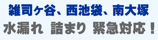 雑司ヶ谷、西池袋、南大塚での水の困った即解決!急な水道トラブルに緊急でかけつけ訪問し、蛇口の水漏れ、トイレ詰まり、排水の溢れ、タンクの故障など修理いたします。